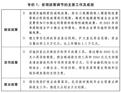 (二)创新和完善宏观调控,经济基本盘进一步巩固。加快构建新发展格局,加强宏观政策跨周期调节,做好保供稳价工作,加大助企纾困力度,实现了较高增长和较低通胀的优化组合,经济保持较好发展态势。