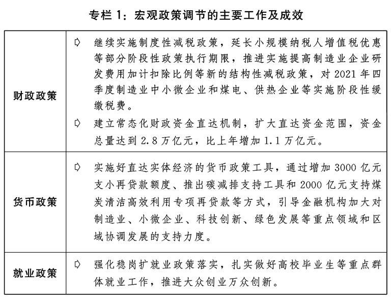 二是保持宏观政策连续性针对性。宏观政策适应跨周期调节需要,保持对经济恢复必要支持力度,同时考虑为今年应对困难挑战预留政策空间。积极的财政政策提质增效、更可持续。保持必要的财政支出规模,地方政府专项债券发行使用管理进一步优化,建立常态化财政资金直达机制,将2.8万亿元中央财政资金纳入直达范围,及时为基层保基本民生、保工资、保运转提供财力支持。全年新增减税降费为市场主体减负超过1万亿元。对制造业中小微企业、煤电和供热企业实施阶段性缓缴税费。货币政策灵活精准、合理适度,灵活运用降准、再贷款、再贴现等多种政策工具,两次全面降准,流动性保持合理充裕,广义货币供应量(M2)余额和社会融资规模存量分别增长9%和10.3%。加大对实体经济、重点领域和薄弱环节的支持力度,企业综合融资成本稳中有降,全年新增人民币贷款19.95万亿元,比上年多增3150亿元,大型商业银行普惠小微企业贷款增幅超过40%,企业贷款平均利率为4.61%,比上年下降0.1个百分点。强化稳岗扩就业政策落实,扎实做好高校毕业生等重点群体就业工作,推进大众创业万众创新。