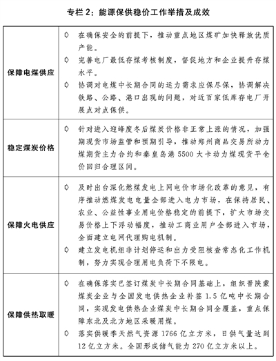 三是粮食能源等重要资源保供稳价工作有力有效。针对玉米、煤炭、铁矿石、铜铝锌等大宗商品价格异常波动,及时采取供需双向调节、期现货市场联动监管、预期引导等措施,打出保供稳价的政策组合拳,有力促进了价格回归合理区间。加强粮食市场调控,合理安排进口和政策性粮食库存销售,有效保障粮食市场稳定供应。加强期货市场监管和新棉收购引导,适时增加中央储备棉投放,促进棉花市场平稳有序运行。着力解决煤炭电力供应紧张问题,推动煤炭增产增供和价格回归合理水平,支持发电供热企业纾困解难,提升煤电支撑保障能力,改革完善煤电价格市场化形成机制,扩大市场交易价格上下浮动幅度,加强煤炭、液化天然气(LNG)等能源物资产运需衔接和运输保障,确保民生和公共用能需求,推进全社会节约用电。发挥跨部门协调工作机制作用,做好化肥市场保供稳价工作。制定实施原材料价格上涨应对方案以及分品种保供稳价工作方案。发挥国家储备市场调节作用,分批投放原油成品油和铜铝锌等国家储备。