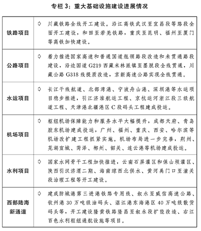 四是适度超前开展重大基础设施建设。精准有效推进交通、水利、物流、能源、新型基础设施、民生等领域重大基础设施项目建设。推进川藏铁路、西部陆海新通道、沿江高铁、一批铁路专用线重点项目和川藏公路G318线提质改造等加快建设。整体推进京津冀、长三角、粤港澳大湾区城市群城际铁路、市域(郊)铁路建设。鼓励推广轨道交通+土地综合开发模式经验。做好中长期铁路网、国家公路网和全国港口与航道布局规划修编,强化国家公路、港口和高等级航道网络功能。推动三峡水运新通道研究论证。实施国家水网重大工程。加快发展公铁水多式联运。提升枢纽机场综合保障能力和服务水平,加快培育支线航空市场,提高国际航空货运能力。加快“支点城市+骨干走廊”现代流通网络建设。稳步推进国家物流枢纽、国家骨干冷链物流基地建设,强化冷链运输环节疫情防控措施,完善“321”冷链物流运行体系。加快物流业制造业融合创新发展,积极推动多式联运、智慧物流等新业态新模式发展。布局一批新型基础设施项目,加快推进5G、千兆光网、一体化大数据中心、北斗产业化重大工程、民用空间基础设施等建设,推动传统基础设施智能化改造。