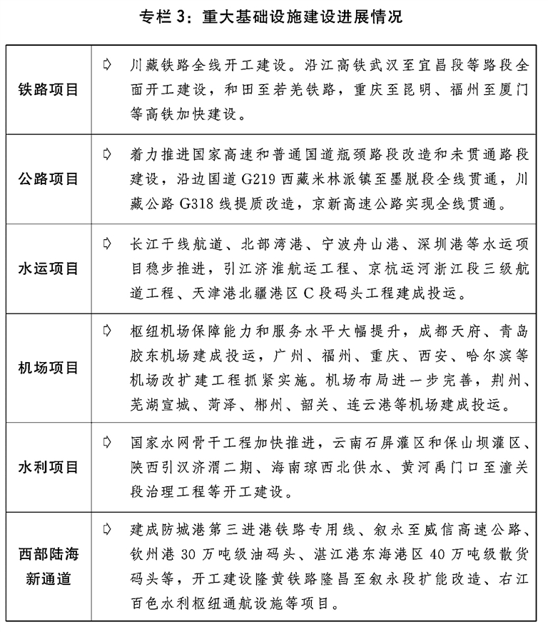 三是基础设施发展质量效益不断提升。川藏铁路、西部陆海新通道、沿江高铁等重大项目建设进展顺利,乌东德水电站12台机组全部建成投产,雅鲁藏布江下游水电开发前期工作有序推进。全年铁路投资完成7489亿元,铁路营运总里程突破15万公里,其中高铁运营里程突破4万公里,“四纵四横”高铁网全面建成,“八纵八横”高铁网正在加密形成。■下转第5版  ■上接第4版  修订国家公路网规划和全国港口与航道布局规划,公路水路建设稳步推进,建成自动化码头10座。革命老区、沿边抵边基础设施建设扎实推进。加快推进新型基础设施建设,建成全球最大的5G独立组网网络。交通低碳、智能发展加快推进。
