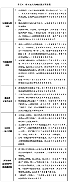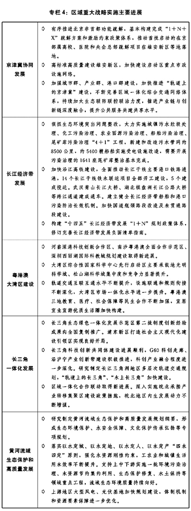 一是区域重大战略深入实施。北京非首都功能疏解取得新突破,国务院印发《关于支持北京城市副中心高质量发展的意见》,雄安新区进入大规模建设阶段,落实支持天津滨海新区高质量发展的意见,张家口首都水源涵养功能区和生态环境支撑区加快建设。长江经济带生态优先、绿色发展深入推进,生态环境突出问题整改和污染治理“4+1”工程稳步推进实施,生态环境系统保护修复成效明显,长江十年禁渔实现良好开局,水生生物资源逐步恢复,沿江综合交通运输体系加快构建,长江保护法正式实施。粤港澳大湾区建设稳步推进,中共中央、国务院印发《横琴粤澳深度合作区建设总体方案》、《全面深化前海深港现代服务业合作区改革开放方案》,基础设施和公共服务融合有序开展。长三角一体化发展深入推进,基础设施互联互通水平持续提升,一体化发展体制机制不断优化,中共中央、国务院印发《关于支持浦东新区高水平改革开放  打造社会主义现代化建设引领区的意见》,构建长三角世界级港口群形成一体化治理体系、共建虹桥国际开放枢纽等重大任务有力推进,生态绿色一体化发展示范区建设取得显著成效。“十四五”黄河流域生态保护和高质量发展实施方案印发,农业、工业、城镇生活和尾矿库污染“3+1”综合治理方案扎实推进,污染防治、生态保护修复、深度节水控水、水土保持等领域重大工程项目稳步实施,在黄河省区完成1.2万平方公里水土流失治理任务。