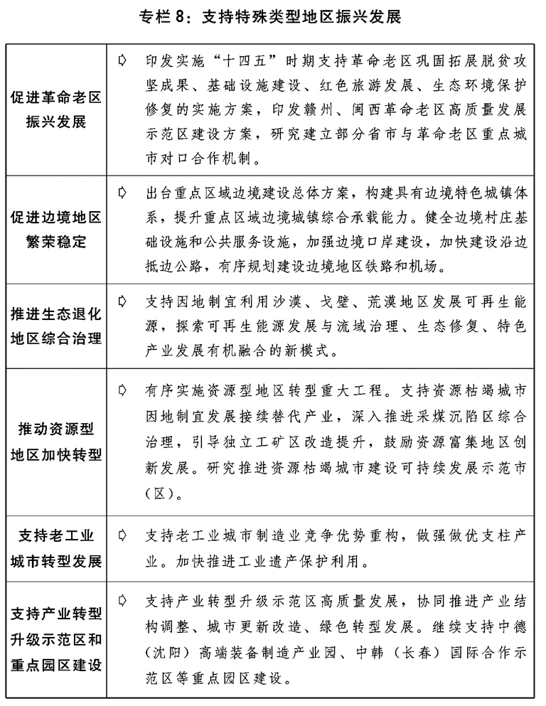 二是提高区域协调发展水平。推动西部大开发形成新格局,发挥风、光、水电和矿产资源优势建设大型清洁能源基地。积极发展文化和旅游产业。实施重要生态系统保护和修复工程,加快重大项目规划建设。推进贵州大数据综合试验区建设。积极稳妥推进雅鲁藏布江下游水电开发等重大工程。推动东北振兴取得新突破,组织实施好东北全面振兴“十四五”实施方案,继续推进黑瞎子岛中俄国际合作示范区建设,积极推动大小兴安岭林区生态保护与经济转型,稳步推进长吉图开发开放先导区发展,推动《东北振兴重点项目三年滚动实施方案》重点项目加快建设。推动中部地区高质量发展,推动湘鄂赣协同高质量发展,支持晋陕豫黄河金三角承接产业转移示范区建设,支持山西进一步深化能源革命综合改革试点,推进淮海合作区协同发展,支持中国(武汉)光谷建设,编制出台洞庭湖生态经济区规划。鼓励东部加快高质量发展,支持福建高质量发展及平潭综合实验区建设,推动山东新旧动能转换综合试验区建设取得新进展。支持民族地区改善生产生活条件,加强各民族交流交往交融,铸牢中华民族共同体意识。推动革命老区、边境地区、生态退化地区、资源型地区、老工业城市等特殊类型地区振兴发展,推进国家级新区、临空经济示范区、承接产业转移示范区等功能平台建设,推动国家自主创新示范区和高新区高质量发展。支持海洋经济发展示范区、现代海洋城市等建设,提升海洋资源开发利用水平。