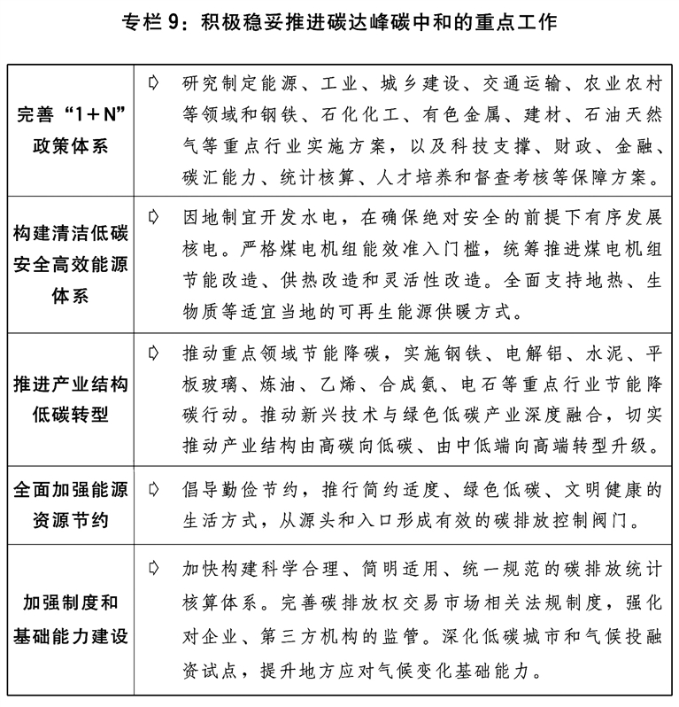 二是积极稳妥推进碳达峰碳中和。完善碳达峰碳中和“1+N”政策体系,实施“碳达峰十大行动”,坚持“全国一盘棋”。大力发展非化石能源,建设大型风电、光伏基地项目,积极发展分布式新能源,积极推动海上风电集群化开发,稳妥推进西南等地大型水电基地建设,大力发展抽水蓄能,在确保绝对安全的前提下积极有序发展核电,推进煤炭清洁高效利用。提升电网对可再生能源发电的消纳能力。做好全国碳排放权交易市场第二个履约周期管理。实施节能降碳改造升级。积极研究开发碳捕捉利用与封存技术。优化完善能耗双控政策,合理增加能耗总量弹性,新增可再生能源和原料用能不纳入能源消费总量控制,推动能耗“双控”向碳排放总量和强度“双控”转变。全面加强能源资源节约,强化工业、交通和建筑节能,不断降低单位产出能耗物耗和碳排放。对标能效标杆水平,推动能效低于基准水平的重点行业企业,有序实施改造升级,促进高耗能行业高质量发展。继续做好碳达峰碳中和及应对气候变化国际谈判与合作,主动参与全球绿色治理体系建设,加强绿色经贸、技术与金融合作。