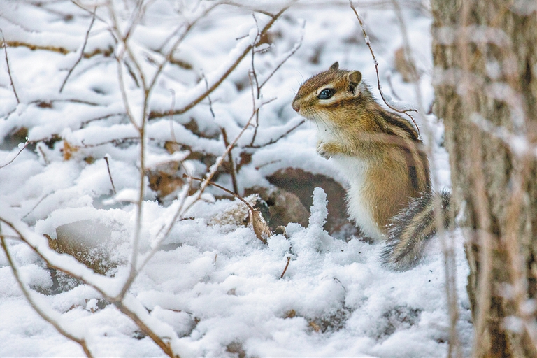 阿荣旗那吉镇滨河公园,一只花栗鼠在雪地觅食。