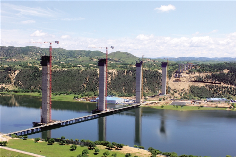 西拉沐沦河特大桥为变截面预应力混凝土矮塔斜拉桥,桥长2064米,主跨240米。该桥最高距离水面为208米,相当于69层楼高。萨岭河大桥长988米,共19跨,主墩最高处距地面80.5米,相当于27层楼高,目前,萨岭河大桥主桥已顺利合龙。萨岭河支流桥全长248.4米,最高墩柱46米,由于线路与河流交角较大,采用左右幅错孔布置施工。地质结构复杂是所有大桥建设中遇到的一大难题,为有效解决高墩柱施工技术难度大、安全风险高等突出问题,施工中,建设单位将“准、新、细”标准化管理紧扣全程,高起点、高质量严把工序关,取得了预期效果。