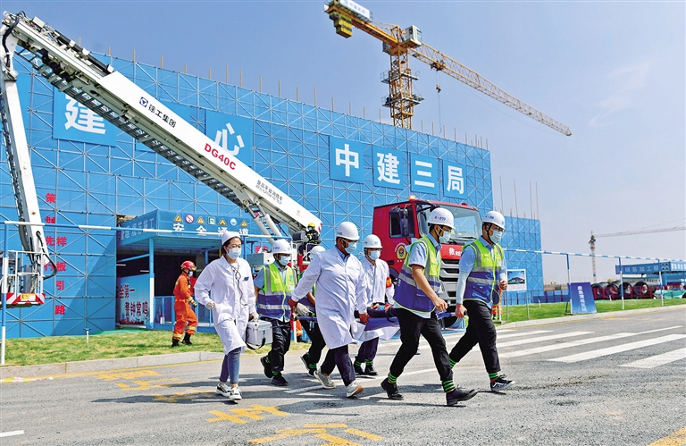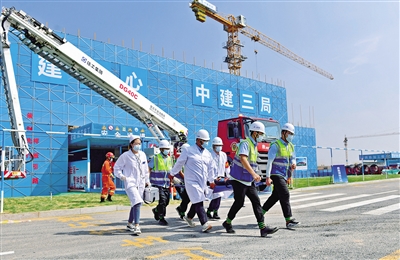 8月4日,工作人员在应急演练中转运“伤员”。当日,内蒙古自治区2022年度建设工程质量安全标准化观摩培训活动在中建三局内蒙古警察职业学院项目部启动,活动围绕智慧工地、绿色施工、安全管控等内容为观摩人员全面展示了一个标准化工地建设样本,来自全区各盟市的300多名质量安全技术骨干参加了活动。活动同时开展了高处坠落生产安全事故应急救援演练,中建三局项目部启动应急救援预案,通过地空一体化协同,迅速完成救援工作。