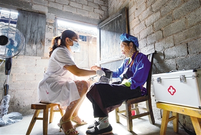 8月19日,乡村医生吴明英在贵州省黔东南苗族侗族自治州丹寨县兴仁镇城望村为村民测量血压。当日是第五个中国医师节,广大卫生与健康工作者坚守岗位,在忙碌中度过节日。 新华社发