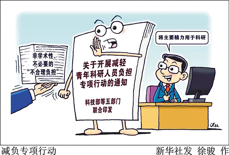 近日,科技部、财政部等五部门联合印发《关于开展减轻青年科研人员负担专项行动的通知》,聚焦青年科研人员关切,推出一系列硬招、实招。新华社发 徐骏 作