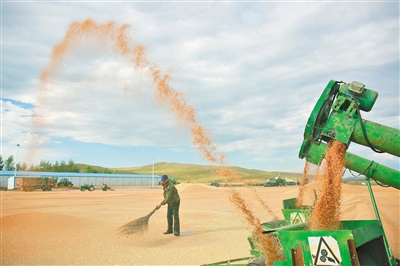 又是一年金秋时,硕果累累收获忙。近日,工作人员正在呼伦贝尔农垦苏沁农牧场有限公司的晾晒场晒麦。