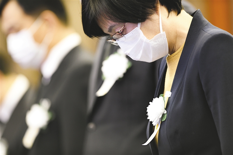 | 这是在上海交通大学,师生代表肃立默哀。 新华社记者 刘颖 摄 |