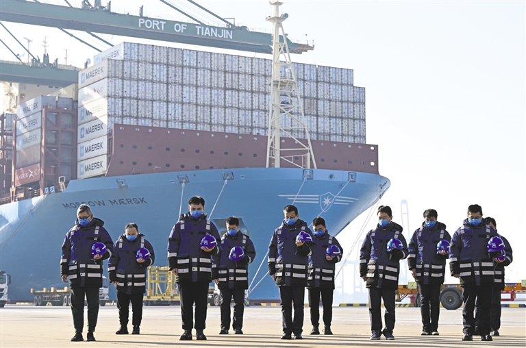 | 这是在天津港太平洋国际集装箱码头,职工肃立默哀。 新华社记者 赵子硕 摄 |