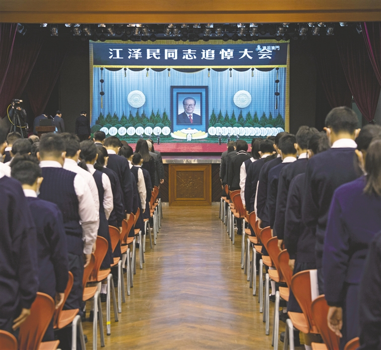 | 这是在澳门濠江中学,师生肃立默哀。 新华社记者 张金加 摄 |