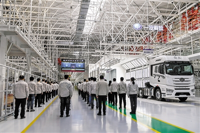 | 这是在吉林长春的一汽解放工厂车间,工人们收看江泽民同志追悼大会直播。 新华社记者 张楠 摄 |