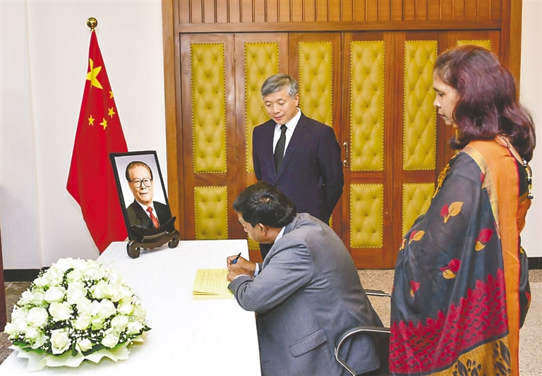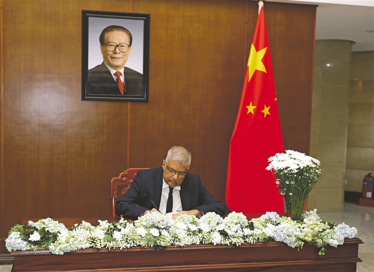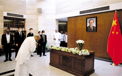 | 十二月二日,斯里兰卡总统维克拉马辛哈在中国驻斯里兰卡大使馆吊唁江泽民同志。 新华社发(萨米拉 摄) |