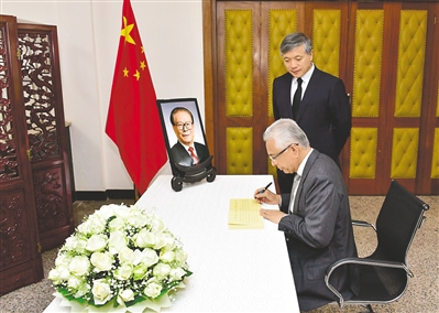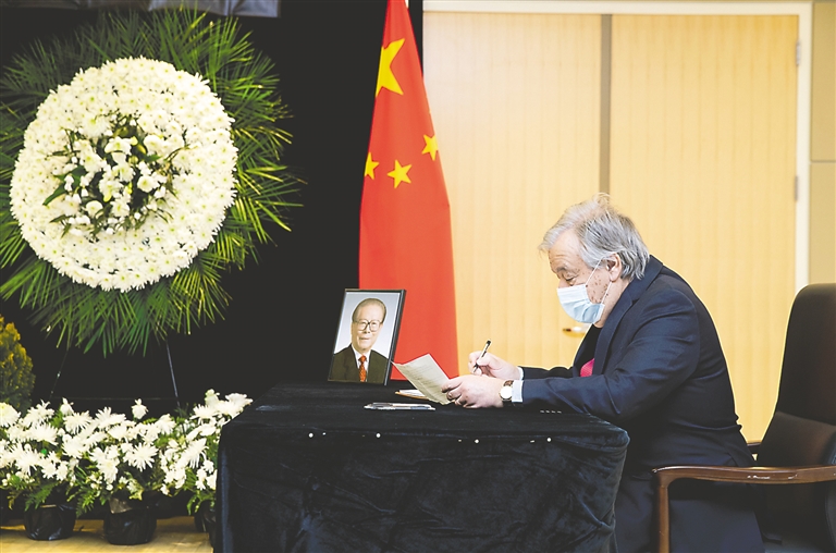 | 十二月五日,联合国秘书长古特雷斯在中国常驻联合国代表团驻地吊唁江泽民同志。