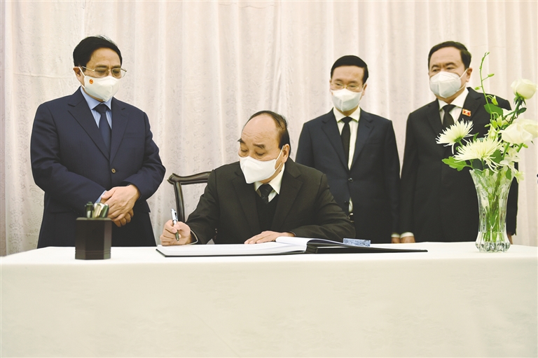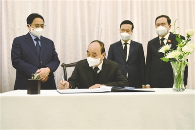 | 12月2日,越南国家主席阮春福(左二)、总理范明政(左一)等在中国驻越南大使馆吊唁江泽民同志。 新华社记者 胡佳丽 摄 |