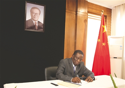 | 十二月五日,津巴布韦总统姆南加古瓦在中国驻津巴布韦大使馆吊唁江泽民同志。 新华社发(肖恩·朱萨 摄) |