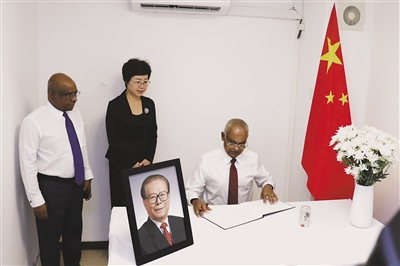 | 12月5日,马尔代夫总统萨利赫(右)在中国驻马尔代夫大使馆吊唁江泽民同志。