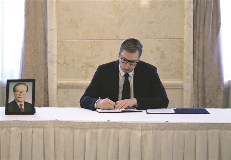 | 12月3日,塞尔维亚总统武契奇在中国驻塞尔维亚大使馆吊唁江泽民同志。 新华社发(中国驻塞尔维亚大使馆供图) |