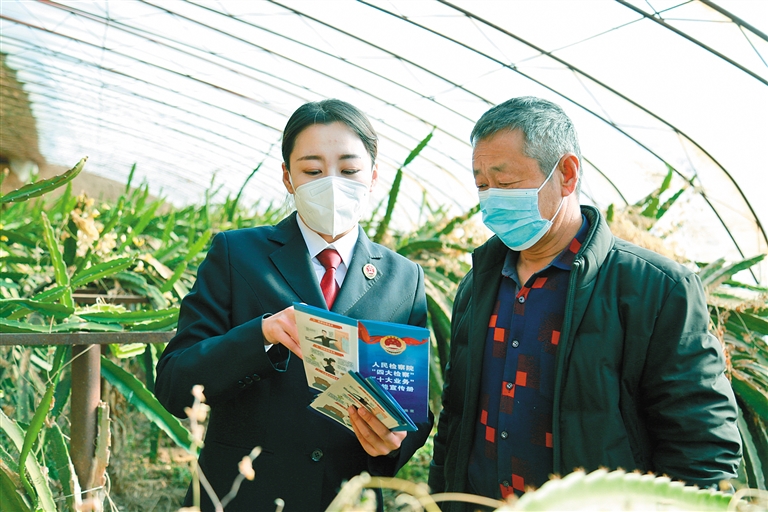 近日,巴彦淖尔市杭锦后旗人民检察院干警走进头道桥镇民建村开展普法宣传活动,将党的二十大精神和宪法知识送到村民中。图为检察干警为村民讲解法律知识。