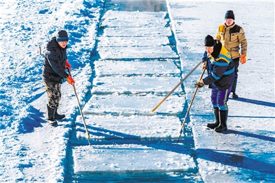 随着冬季冰雪旅游季的开启以及元旦、春节的临近,呼伦贝尔市海拉尔区采冰工作在海拉尔河紧张地进行中。工人们冒着严寒,切割、钏冰、出冰、装车,为冰雕展、冰雪之约主题文博展等活动提供优质冰块。本报记者 李玉琢 摄