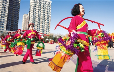 元宵节将至,在呼和浩特市赛罕区政府前广场,演员们进行传统民俗文化表演。由呼和浩特市赛罕区昭乌达南路街道前巧报社区工作人员及居民组成的新春表演团队为市民送上新春祝福。本报记者 怀特乌勒斯 摄