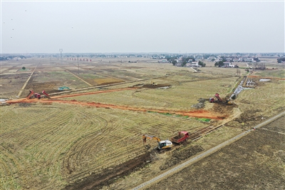 2月2日,工人在湖南省益阳市赫山区笔架山乡中塘村高标准农田建设现场平整土地(无人机照片)。冬闲时节,湖南省益阳市赫山区2022年高标准农田建设项目正在紧锣密鼓地开展,工人们抓紧整治田块,建设排灌渠道,建设田间道路,新建机埠等。 新华社记者 薛宇舸 摄