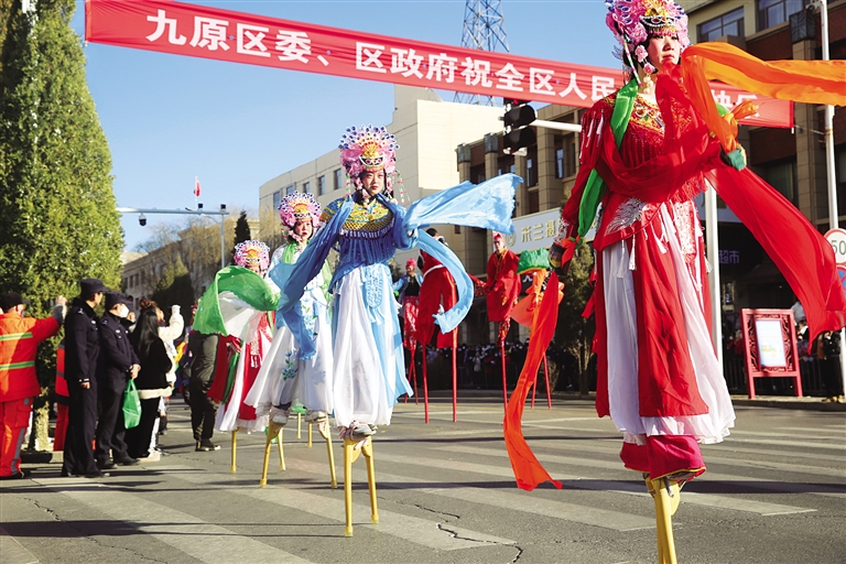 2月4日下午,包头市举行第13届鹿城元宵节民间文艺展演活动。活动以丰富人民群众精神文化生活为宗旨,传承中华优秀传统文化,突出地方民间文化特色,助力提升城市烟火气。此次活动从全市精选了12支展演队伍,内容包括彩车、秧歌、高跷、脑阁、划旱船、舞龙舞狮等。 本报记者 宋阿男 摄