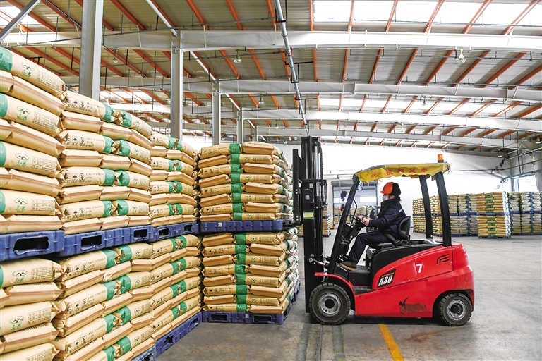2月4日,在卓资县一家化工企业聚氯乙烯车间,工作人员驾驶叉车搬运产品。新春伊始,位于内蒙古乌兰察布市卓资县的化工企业生产线一派繁忙。企业开足马力赶订单,加紧运输化工产品,力争“开门红”。 新华社记者 贝赫 摄