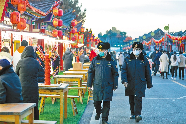 2月4日,呼和浩特市新城区城管队员在恼包村巡查。新春佳节,呼和浩特市大召广场、恼包村等景区举办多场民俗表演活动。连日来,呼和浩特市城管部门加大巡查力度,规范商户经营行为,排查商铺经营安全隐患,为市民创造良好的景区环境。本报记者 马骏驰 摄