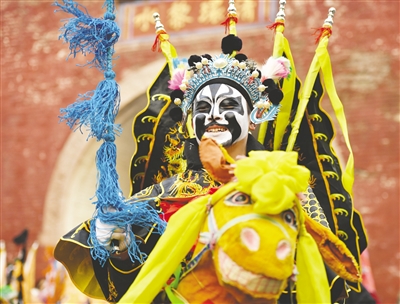 2月6日,社火团队的演员在庙会上表演。当日是农历正月十六,在河南省浚县举行的正月古庙会上,几十支社火团队轮番表演,踩高跷、扭秧歌、耍狮子,锣鼓喧天,热闹非凡,形成一道富有特色的中原文化景观。河南省浚县的正月古庙会已有1600多年历史,有“华北第一庙会”之称,被誉为民俗文化的“活化石”,是中国民间文化保护工程项目、国家级非物质文化遗产。 新华社记者 宋彦桦 摄
