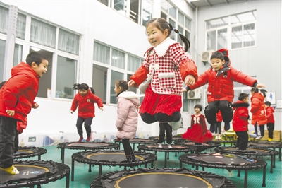 2月8日,浙江省宁波市镇海区澥浦镇中心幼儿园的孩子们在蹦床上练习基本功。近日,多地迎来2023年春季学期开学。孩子们在丰富多彩的活动中开启新学期。 新华社发