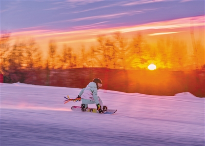 科右前旗巨力很滑雪场,夕阳西下,树影朦胧,滑雪健儿风驰电掣,身姿矫健。