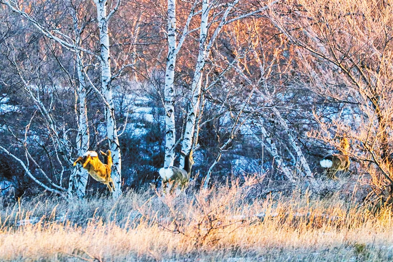 西乌珠穆沁旗,几只狍子穿越白桦林。