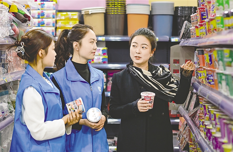 3月24日,专业教师张弋瑄(右)指导学生货品摆放知识。当日,莘莘缘校园新零售平台在内蒙古商贸职业学院投入使用。该平台由内蒙古莘莘缘电子商务有限公司与中粮智尚科技有限公司共同研发,将供应链模块、实体超市,学生实训实践等多种功能融为一体,提供线上下单、线下自提、直播等服务,构建起了校园新零售业态。运行平台的工作人员均来自相关专业的在校大学生和教师,是职业院校深化校企合作,实现产教深度融合的新尝试。 本报记者 怀特乌勒斯 摄