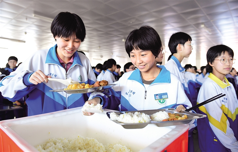 近日,鄂尔多斯市第一中学伊金霍洛分校的学生在学校餐厅打餐。2023年,为进一步提升办学条件,伊金霍洛旗实施教育民生工程,为第二小学、第五小学、第八小学、上湾小学4所学校新建餐厅、宿舍,补齐学校功能短板,满足学生食宿需求。到2023年底,全旗30所中小学将提供校内午餐午休服务,实现住宿就餐全覆盖,解决双职工家庭孩子的接送及午餐午休问题。本报记者 王磊 摄