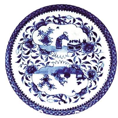 文中这只清代雍正年间青花赏盘直径20.5厘米,瓷质细密,釉色亮丽。自盘沿至盘心,均缀以寓意吉祥如意的青花纹饰。盘心瓷画设计别具匠心,被盛开的牡丹花巧妙地分割成两部分,上下各构成一幅完整画面。上面一幅:桌上摆满了祭品,一位青衣儒生双手合十,满脸虔诚,朝着先祖的灵位膜拜。旋转瓷盘,另一幅画面映入眼帘:清明时节,花开似锦。祭祖的男士手持祭盒,焚香祭拜。两幅瓷画,各自独立,又浑然一体。
