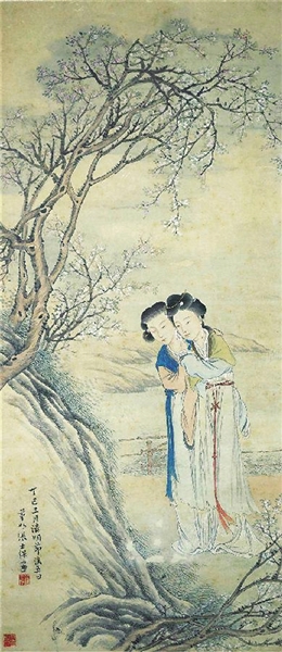 《簪柳图》收藏于北京艺术博物馆,纸本设色,纵106厘米,横43.5厘米。画面描绘的是清明时节郊外梨花开得正艳,主仆二女子在岸边土坡旁踏青赏景,依依不舍离去的样子。妇人梳着倭坠髻,流珠柳簪斜插在发髻间,身穿淡绿色暗花裙,系红色腰带饰一玉珮。侍女梳双丫髻,右耳边插朵花柳簪。画左下侧落款为:丁巳三月清明节后五日,菊如张士保画;钤“张士保”白文印。