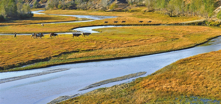 我时常想起陪朝鲁门姨夫在养蓄牧河边放牛的情景,虽然朝鲁门姨夫把纯手工擀制的山羊毛毡子给我铺上,还是有潮气让衣服粘在身上。这时,喝了酒的朝鲁门姨夫,早已进入梦乡,而且鼾声如雷,我更睡不着了。我索性就坐在窝铺的门口看星空,那种感觉很奇妙,虽然星星离我们那么远,但连在一起的星座到银河就使得夜空显得壮阔了。在浩瀚星空下的位于原野上的朝鲁门姨夫孤零零的小窝铺,就像大海中漂泊的小舟,那么渺小。当晨曦来临的时候,风渐渐停息了,远处的雾岚里地平线上露出鱼肚皮白,太阳将要露头,传来养蓄牧河的流水声。窝铺外各种青草和野花上面是密密麻麻的露珠,像一座座宫殿,里面一定住着一颗颗昨夜的星辰。围栏里的牛开始此起彼伏地叫了,打开围栏的门,我甩着长鞭,一个一个放它们出来,防止它们相互顶撞,不一会,一群牛就自由自在地在养蓄牧河畔吃草了。这时,朝鲁门姨夫也做好了饭菜,在窝铺上吃饭特别香,一样的饭菜在家里就吃不出在窝铺的味道。朝鲁门姨夫喝酒也是,平时在家也就半斤的量,在窝铺能喝一斤,还喝得甜嘴巴舌的。吃完早饭后,我和朝鲁门姨夫追随牛群去到养蓄牧河边。这时太阳升起来了,河面上波光粼粼,喝足水的牛站在河里,甩着尾巴驱赶蚊蝇。在太阳光的照射下,牛身上就像披着绸缎一样。各种颜色的牛像一匹匹多彩的绸缎,装饰着养蓄牧河畔。
