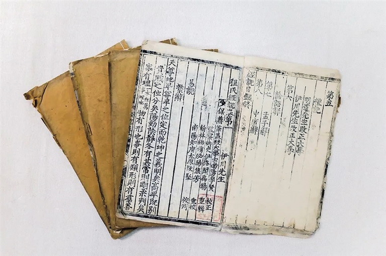 内蒙古自治区图书馆藏《程氏经说》八卷,宋程颐撰,明南阳知府段坚刻本。四册一函。版框高25.5厘米,宽16.5厘米;开本27.7厘米,宽17.4厘米;半叶9行行20字,小字双行同;粗黑口,四周双边,四对黑鱼尾;上对鱼尾中刻“经说”、卷数,下对鱼尾中刻页码;卷首存《经说目录》。
