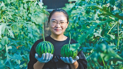 记者在荣誉村的黄瓤西瓜种植基地看到,种植户周新正和她的伙伴们忙着采摘西瓜。拨开繁密的瓜蔓,一排排错落有致、圆润饱满的黄瓤西瓜悬挂在藤条上。“我已经种了10多年黄瓤西瓜,以前1年种3棚还卖不完,现在种几十棚都不够卖。”周新笑着说。