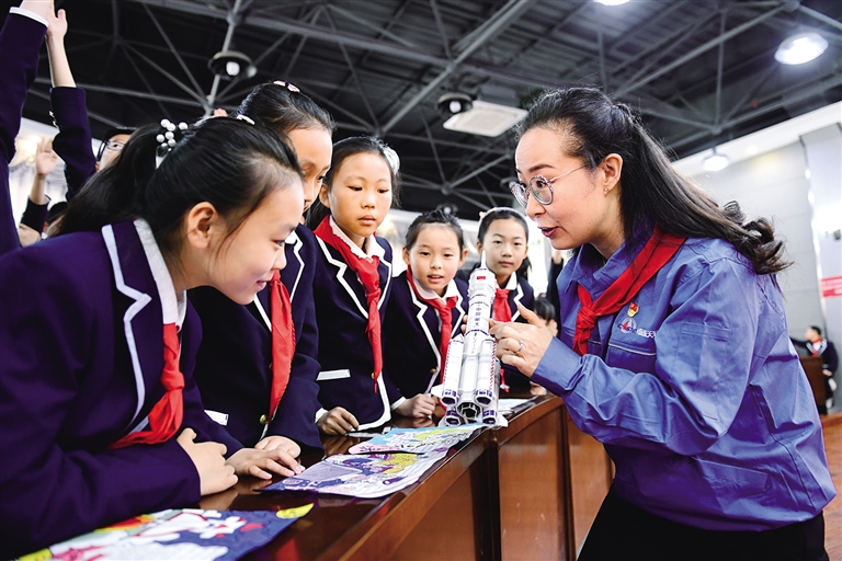 4月21日,中国航天科工六院红峡公司高级工程师于蓓在为呼和浩特市新城区丁香路小学的同学们介绍火箭的工作原理。在第八个中国航天日到来前夕,丁香路小学邀请可敬的航天人为同学们上了一节航天科普公开课,向孩子们播撒航天报国、航天强国的精神火种。 本报记者 王磊 摄