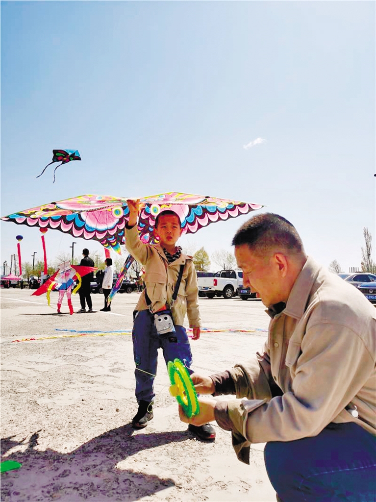 小朋友在父亲的帮助下准备放飞手中的风筝。春和景明,杏花绽放。4月30日,在有“塞外西湖”之称的哈素海湖畔,“乐享五一、约你来嗨”土默特左旗文化旅游景区启动仪式暨哈素海景区“五一”节系列活动开幕。本报记者 郑学良 摄