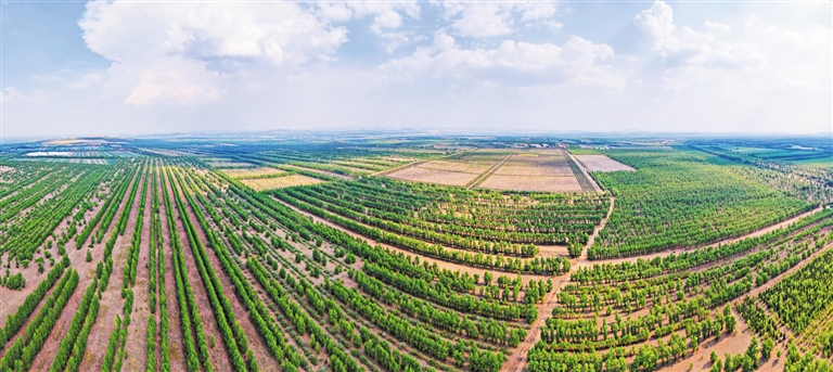 6月17日,航拍赤峰市敖汉旗马场梁生态建设基地,曾经的沙地已变成郁郁葱葱的林地。6月17日是第29个世界防治荒漠化与干旱日,在位于科尔沁沙地南缘的敖汉旗,经过林业工作者坚持不懈地努力,当地生态环境已由上世纪五六十年代的黄沙滚滚、荒山秃岭变为今天的绿洲片片、千峰叠翠。截至2022年末,该旗有林面积达到572万亩,森林覆盖率达44.17%;全旗草原面积106.8万亩,草原植被盖度达到60%以上。本报记者 孟和朝鲁 摄
