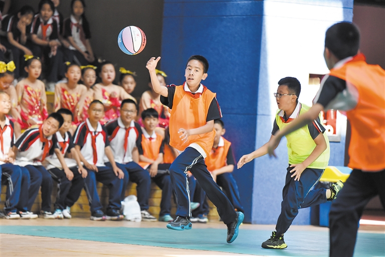6月15日,呼和浩特市石东路小学南校区体育馆内,孩子们在篮球比赛中奋力奔跑。当天,“奔跑吧少年”系列活动暨姚基金希望小学篮球季内蒙古自治区“老牛兄妹”体育器材包捐赠活动在该校举行。该活动旨在让更多的青少年热爱篮球,参与体育,助力双减。本报记者 王晓博 摄