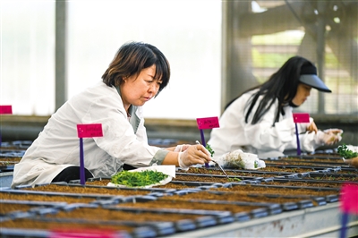 7月6日,在乌兰察布市集宁区内蒙古民丰种业有限公司温室大棚内,工作人员正在培育马铃薯新品种。该公司是一家集马铃薯、燕麦研发、育种、种植、加工、销售于一体的现代化农业企业,拥有1万平方米马铃薯脱毒组培中心,700亩的温室网棚,8万亩高标准农场,年可生产脱毒苗5000多万株、原原种1亿多粒、种薯3万吨、加工薯6万吨。本报记者 孟和朝鲁 摄