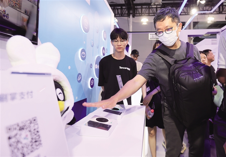 7月6日,参观者在腾讯展位体验刷掌支付。当日,2023世界人工智能大会在上海世博中心拉开帷幕。本届大会主题是“智联世界 生成未来”。大会除了举办科学前沿和产业发展全体会议以及主题论坛等活动外,还有超400家参展企业在世博展览馆5万平方米主展览区内展示包括大模型、芯片、机器人、智能驾驶等领域的科技成果。