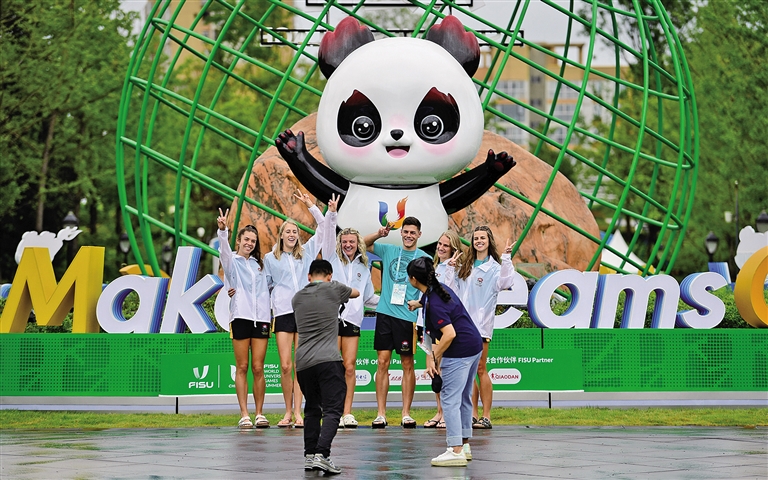 7月27日,外国运动员在成都第31届世界大学生运动会运动员村合影留念。28日,本届赛事将在四川省成都市开幕,来自170个国家和地区的大学生汇聚这座历史名城,展开一场青春的较量。本报记者 王磊 摄
