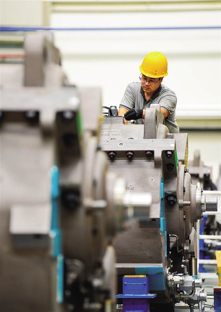7月31日,南高齿(包头)传动设备有限公司生产车间内,工作人员正在生产线上忙碌。该公司是一家从事大功率风力发电机组齿轮箱研发、制造、维修服务的高技术装备制造企业,拥有全球顶尖现代化制造设备,产品质量寿命及交付率在行业内处于领先水平,实现关键部件国产化,年生产齿轮箱600台。目前,全球每新增3台风电主齿轮箱就有1台来自南高齿制造。本报记者 孟和朝鲁 摄